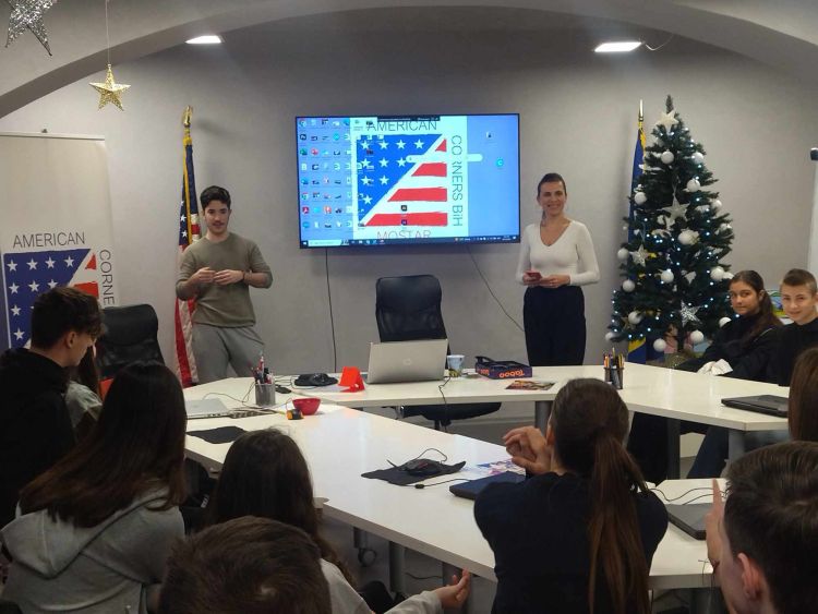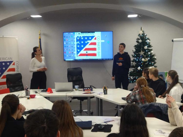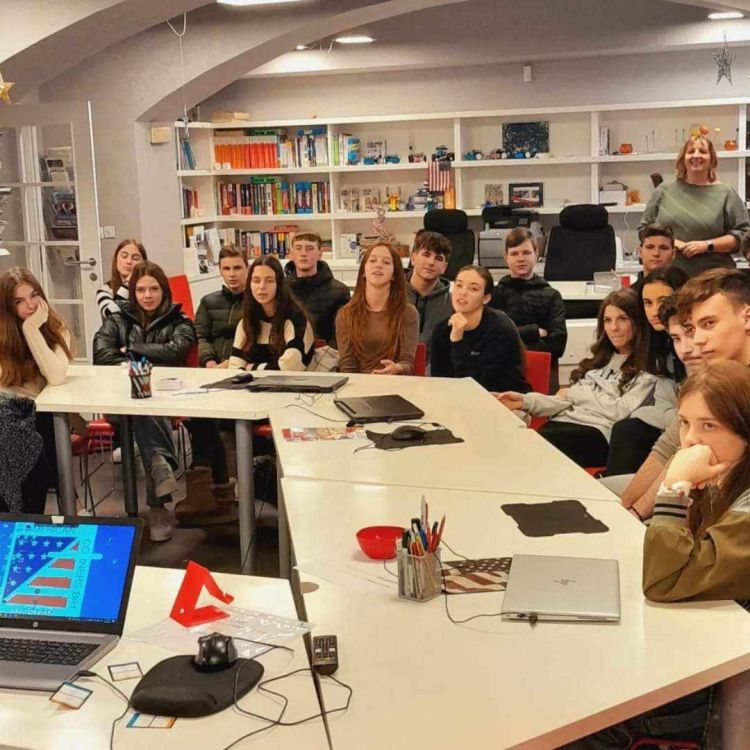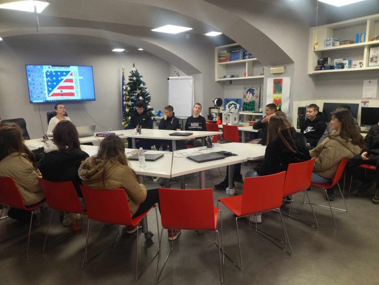 U utorak su svi devetaši s nastavnicom engleskog jezika posjetili Američki kutak. Voditeljica Kutka je učenicima objasnila koje programe im Kutak nudi u idućoj školskoj godini kad budu srednjoškolci. Nakon toga je uslijedio konverzacijski dio i na kraju igrica.
